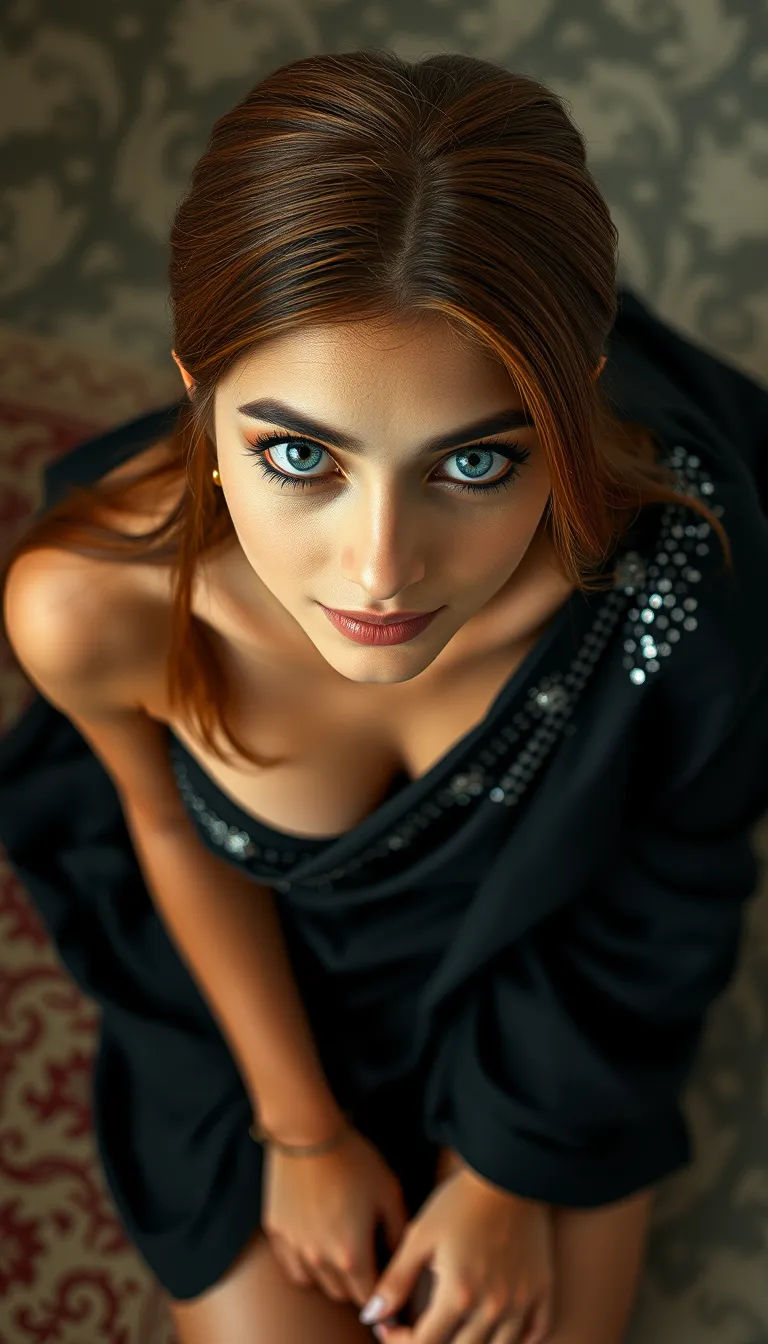Shot from above, 20 years old India lady, [slim lady, slender lady], with big expressive eyes, [blue piercing eyes], medium length chestnut hair, [smooth hair, hair behind ears], wearing black sequin saree, [very hot saree, very tight blouse, low neckline], kneeling, bare neck, bare legs, beautiful symmetrical face, loving look, looking up at the viewer, masterpiece, highly detailed, hyperrealistic, 64k