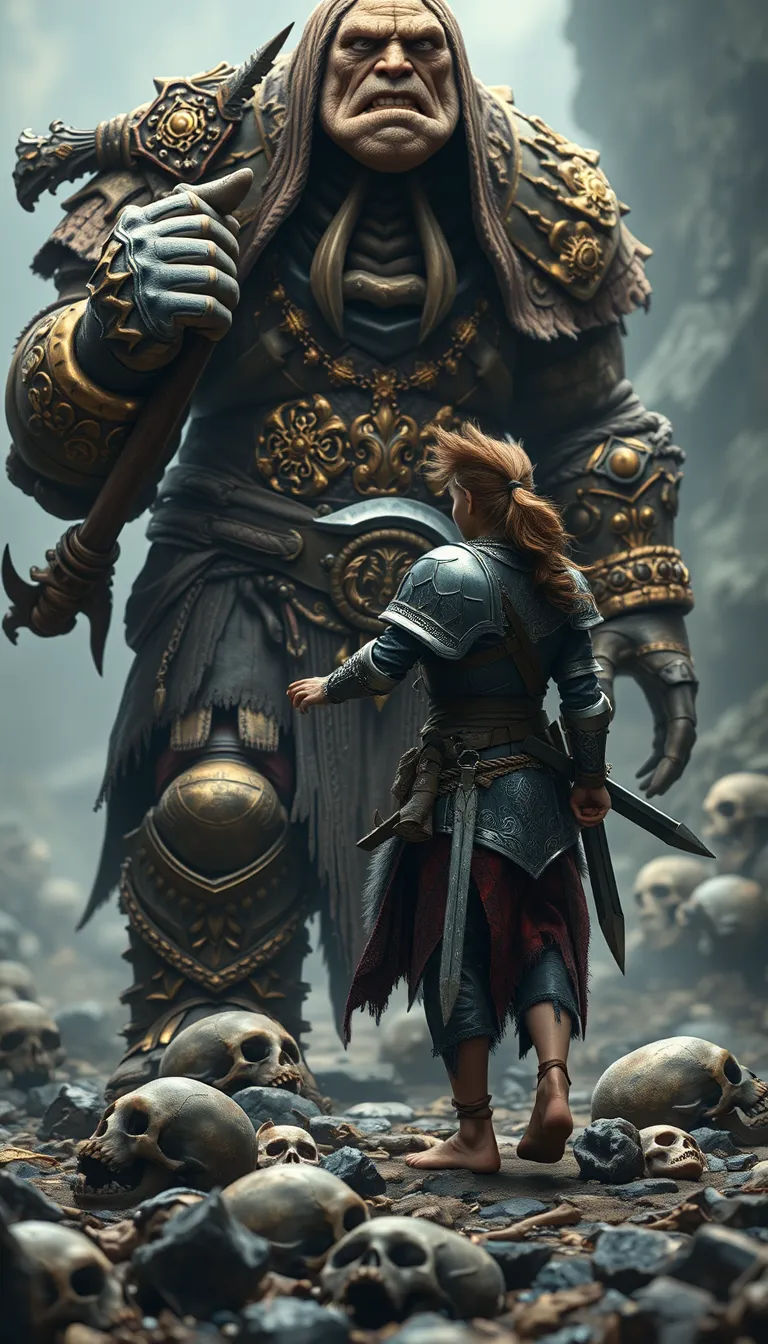 Ultra realistic looking DND character, ), hooded giant ogre, holding a giant cursed axe and walking menacing, walking over crushed skeletons, golden ornamented bracelets, jeweled belt, and necklaces. Facing him, stands a tiny barefoot female warrior with full armor, arms extended to the sides, holding a sword and a dagger, standing confidently, dramatic scene, cinematic