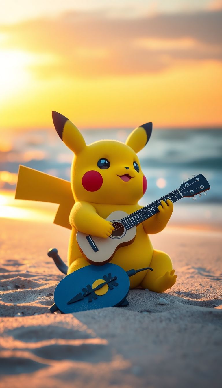 A photorealistic depiction of a cute little Pikachu, setting on the beach and playing guitar, set against the backdrop of a sunset beach environment. with a look of wonder or excitement on my face, as if I've just discovered or captured it. The lighting is bright and natural, with a sense of depth and dimensionality that makes the scene feel lifelike and immersive. side-angle shot of Pikachu sitting 40 degree
