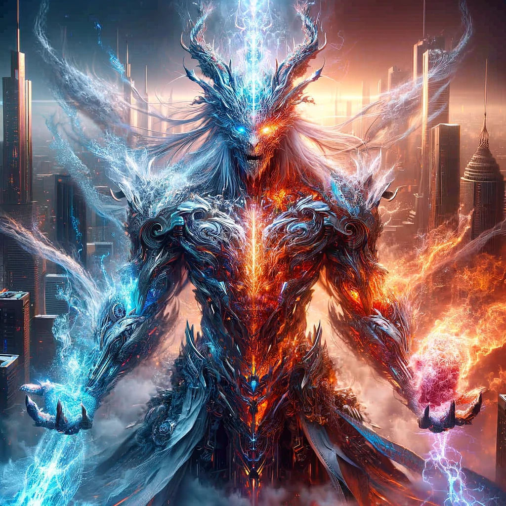 Envision an elemental sentinel of a stoic creature embodied as a guardian of both destruction and preservation, with one side ablaze with wild flames and the other encased in a solid ice armor. This sentinel stands with wings outstretched within a city torn between a raging inferno and a frozen wasteland, embodying the battle between heat and cold. robiness, masterprompter.