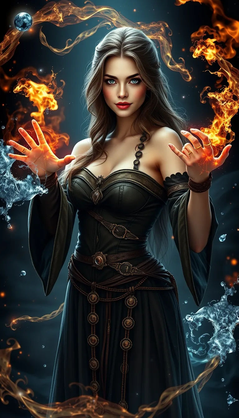 A stunning slim female wizard stands poised in a magical dark fantasy realm, casting a mesmerizing spell with elemental energies swirling around her. She wears an alluring off-shoulder costume adorned with elaborate rings, showcasing intricate details and textures. Her beautiful, fair skin glows under soft, ethereal lighting, emphasizing her enchanting blue eyes and captivating smile. Elements of fire, water, wind, and ice dance in a perfect dynamic composition, creating a breathtaking, ultra high-resolution masterpiece.