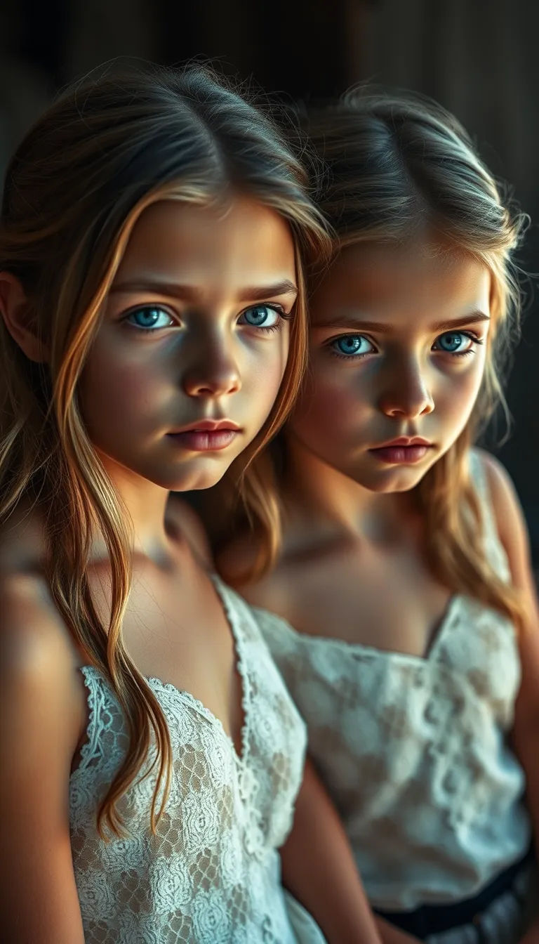 Fashion photography, of two 12 years old Dutch dark blond twins sisters ocean blue eyes in Bali, volumetric lighting, cinematic angle, glamour lace, highres, realistic photo, professional photography by David Hamilton, dynamic light,